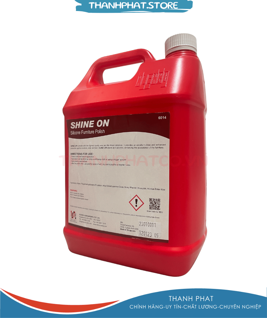 Shine On là hỗn hợp dung dịch gốc silicone, dầu khoáng, phụ gia đặc biệt sử dụng để đánh bóng và bảo dưỡng những chi tiết đồ nội thất mang lại hiệu quả tối ưu. Sản phẩm thích hợp đánh bóng bảo dưỡng cho bề mặt kính, nhựa, gỗ, da, kim loại, sơn phủ, màn hiển thị của xe hơi hay các trang thiết bị nội thất văn phòng như: bàn ghế, tủ tài liệu, gương. Sản phẩm của nhà sản xuất hóa chất đánh bóng Klenco Pte xuất xứ Singapore, quy cách đóng gói can 5 lít và thùng 20 Lít